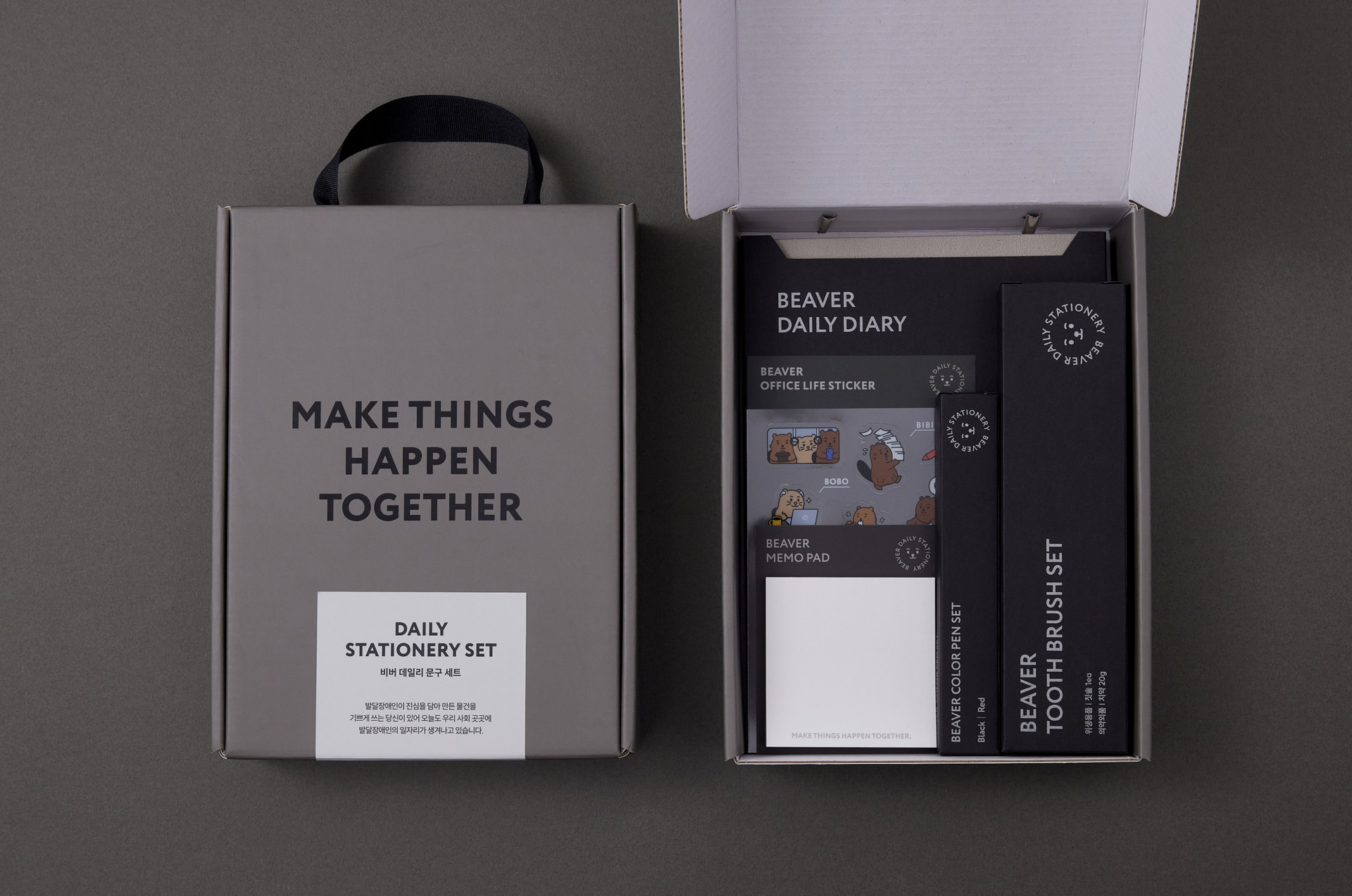 Bravo Beaver is a project that connects and sponsors job opportunities for individuals with developmental disabilities in rural areas, linking them with companies in urban centers that are obligated to hire people with disabilities. We have designed a Stationery packaging for Bravo Beaver's Incheon branch, which is located in Bupyeong-gu, Incheon. (2025)