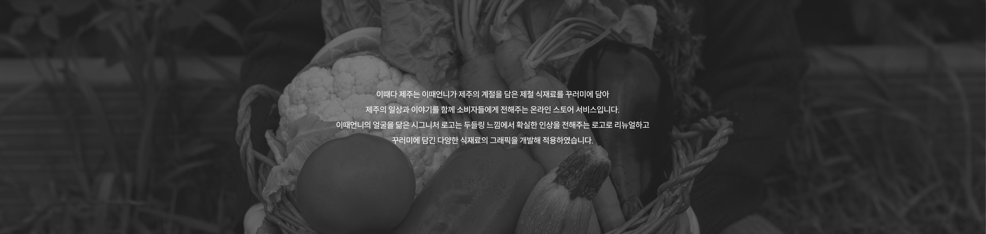 이때다 제주는 이때언니가 제주의 계절을 담은 제철 식재료를 꾸러미에 담아 제주의 일상과 이야기를 함께 소비자들에게 전해주는 온라인 스토어 서비스입니다. 이때언니의 얼굴을 닮은 시그니처 로고는 두들링 느낌에서 확실한 인상을 전해주는 로고로 리뉴얼하고 꾸러미에
